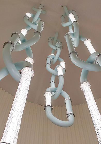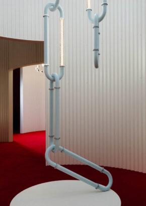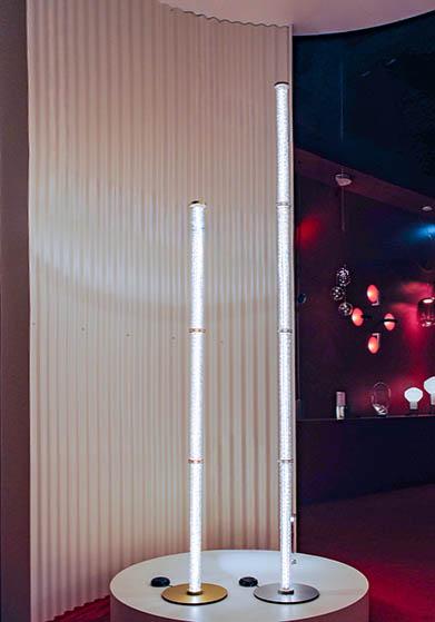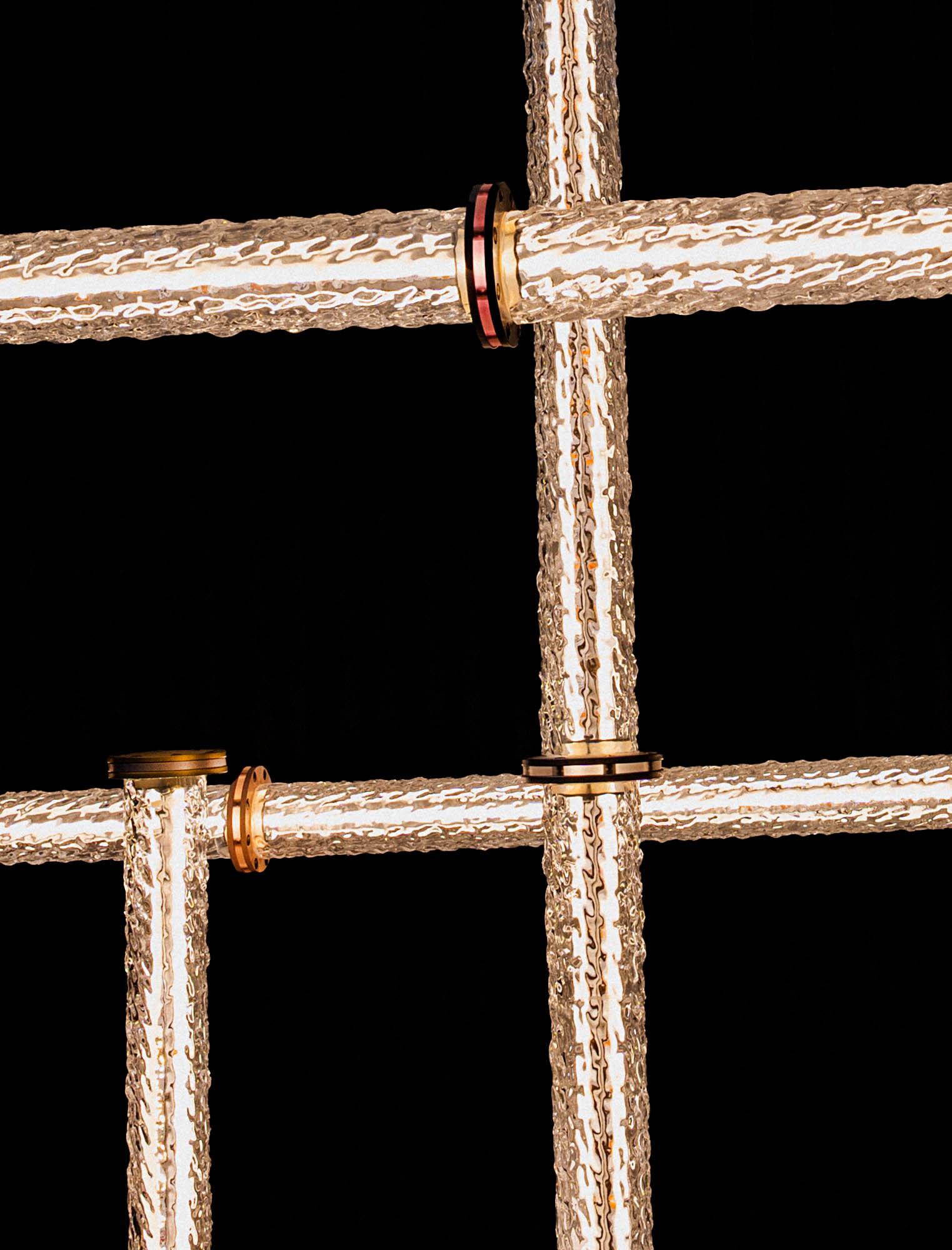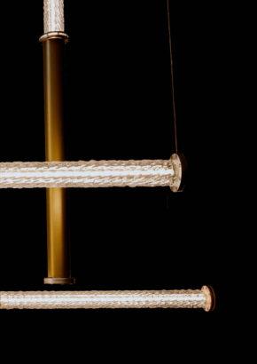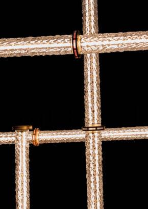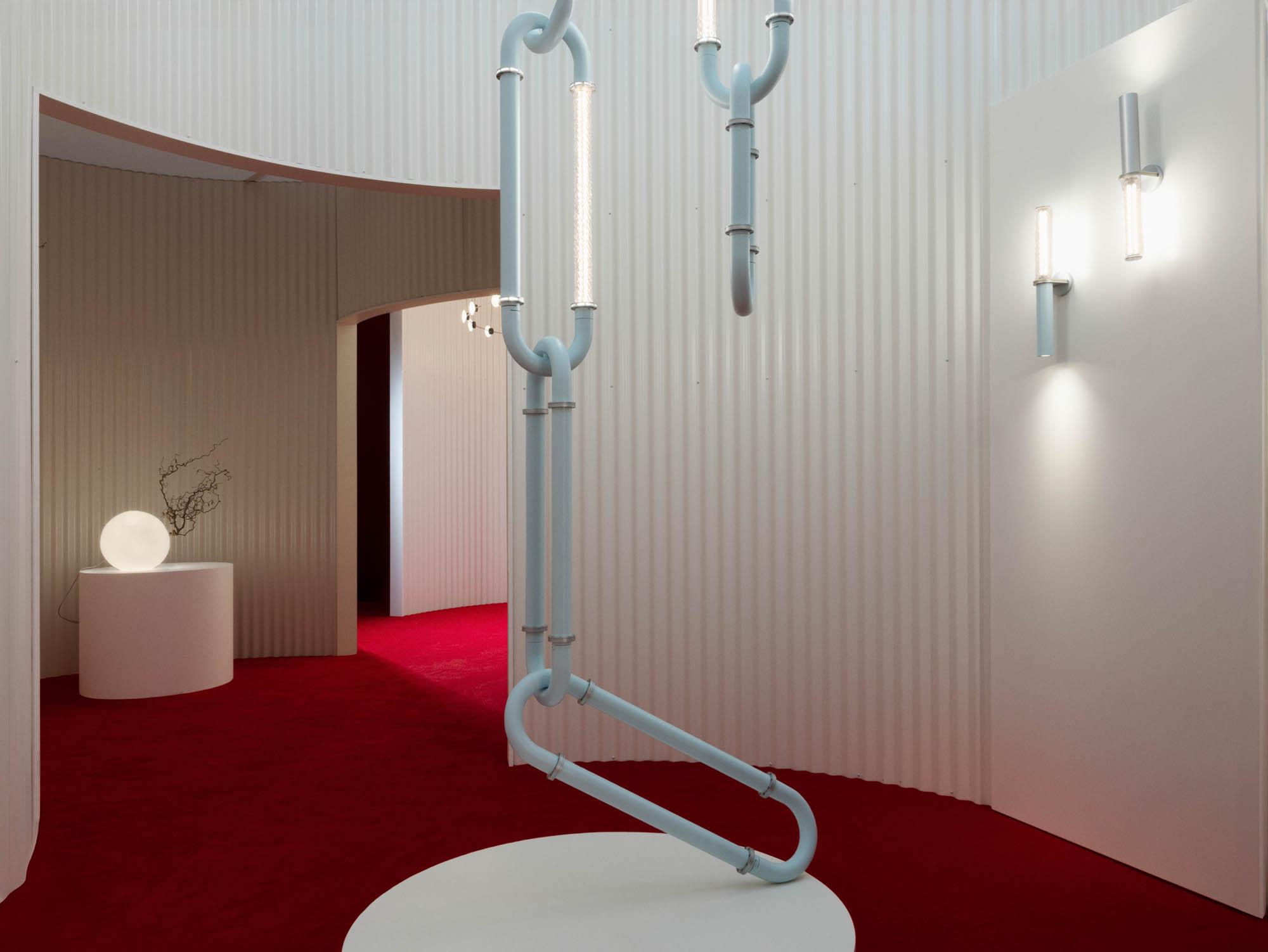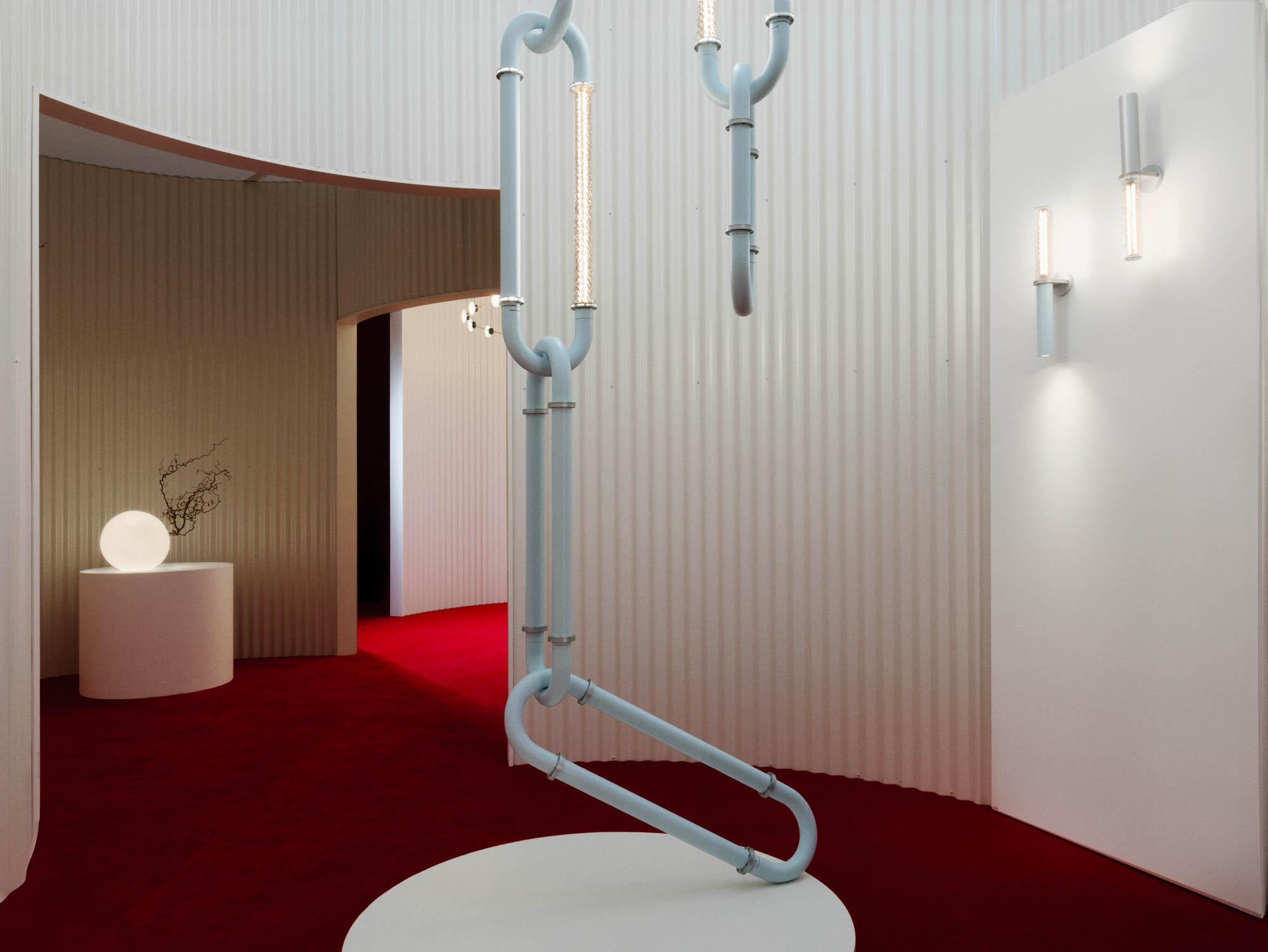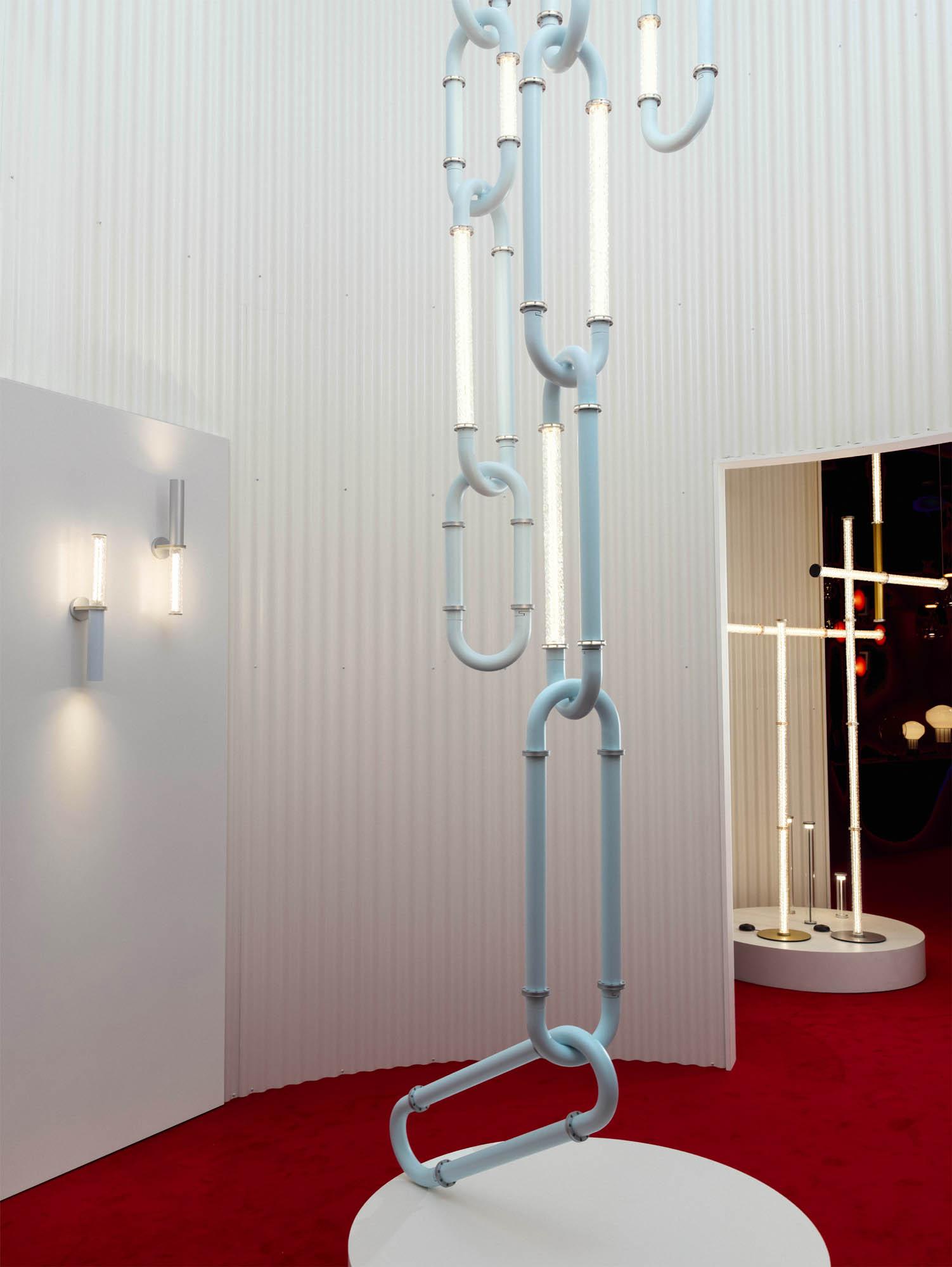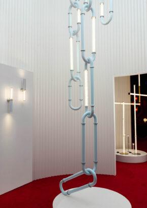 Santo offers pendants, wall lights, floor lamps, and a configurable system that adapts seamlessly to any space. The configurable system is distinguished by its bold design, resembling oversized interlocking chain links that can be composed into dramatic, architectural statements. Each diffuser is crafted from blown glass using a static mold, creating subtle variations that enhance the collection’s poetic character.